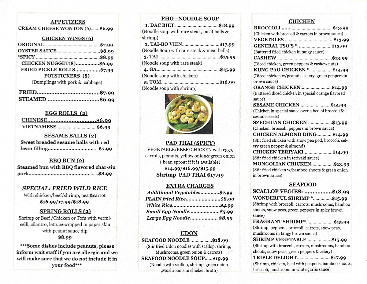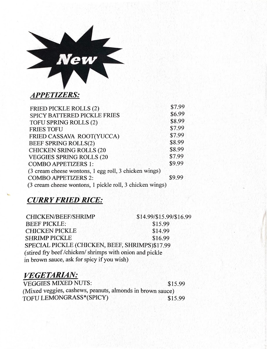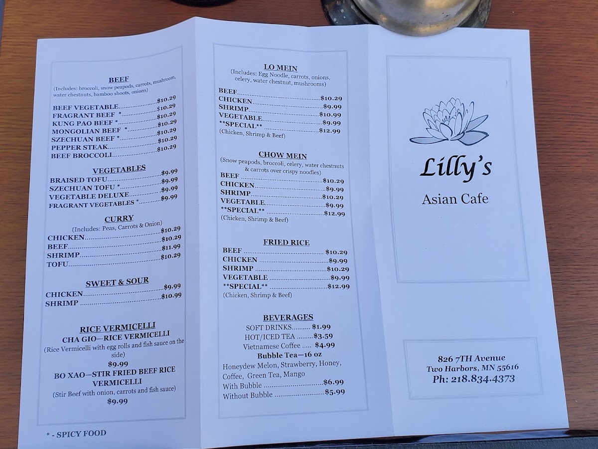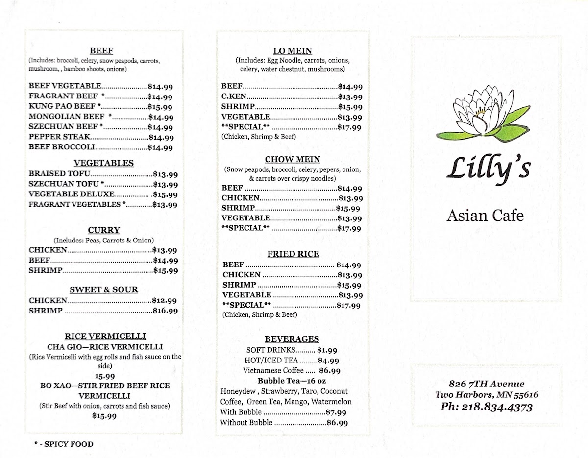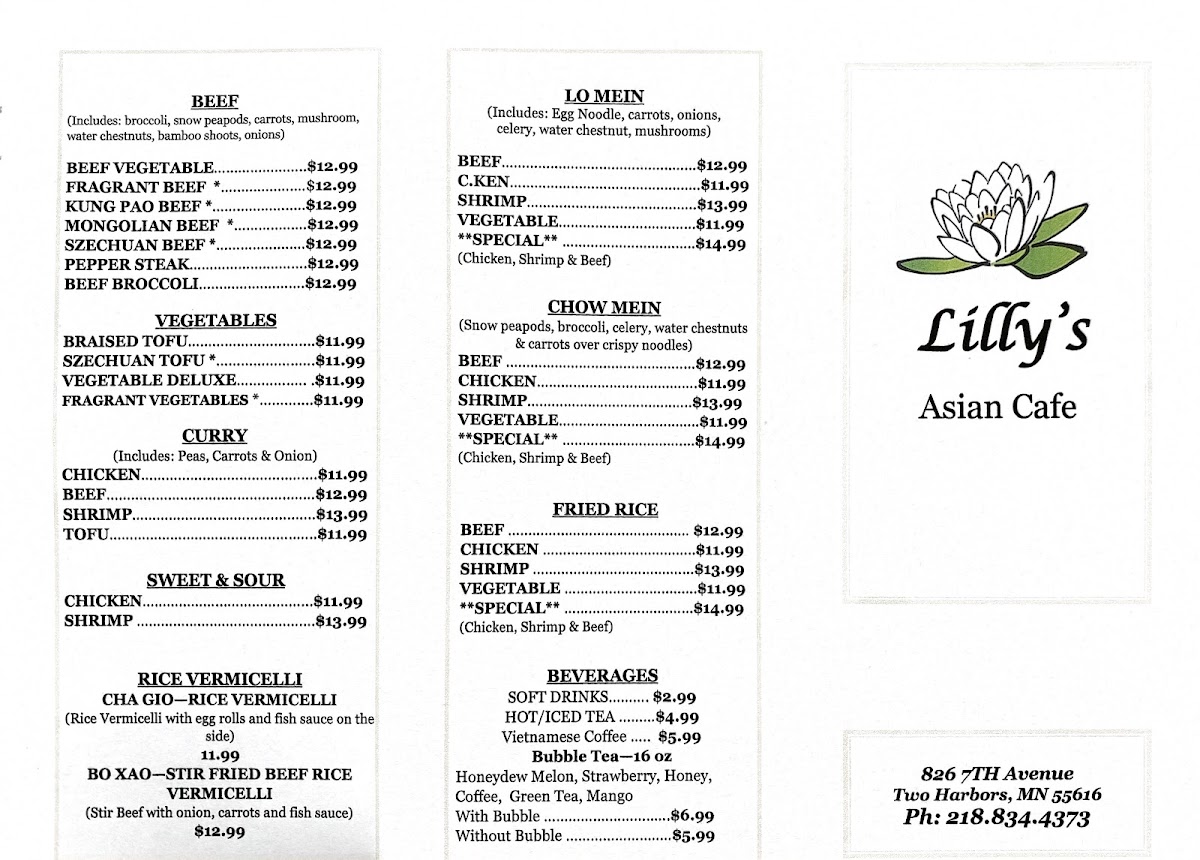 The menu at Lilly's Asian Cafe in Two Harbors, MN, offers a delightful mix of classic and unique Asian dishes. Appetizers like Fried Pickle Rolls and Spicy Battered Pickle Fries set the tone for a flavorful meal, while Tofu Spring Rolls and Fried Cassava Root provide lighter options. The Curry Fried Rice comes in various variations, such as Beef Pickle, Chicken Pickle, and Shrimp Pickle Special, catering to different tastes. For those seeking vegetarian choices, dishes like Veggies Mixed Nuts and Tofu Lemongrass are available. The restaurant also serves a variety of pho, including the popular Dac Biet and Tai-Bo Vien. Those craving noodle soup can choose from options like Seafood Noodle Soup or the comforting Seafood Noodle. Chicken lovers can enjoy favorites like General Tso's, Cashew Kung Pao Chicken, or the zesty Orange Chicken, while beef lovers have the choice of Szechuan Beef and Mongolian Beef. Seafood options are also abundant, with dishes like Wonderful Shrimp and Shrimp Vegetable Triple Delight. Vegetarian options like Braised Tofu and Vegetable Deluxe are perfect for those avoiding meat. Popular side items include Potstickers, available steamed or fried, and an array of rice and noodle dishes, including Lo Mein and Fried Rice in different meat and veggie combinations. The drink menu features refreshing Soft Drinks and the aromatic Vietnamese Coffee. For something extra, try the Special Pad Thai or the hearty Egg Drop and Hot & Sour Soups. Whether you're in the mood for something traditional or craving an adventurous dish, Lilly’s Asian Cafe has a diverse menu that promises a satisfying dining experience.