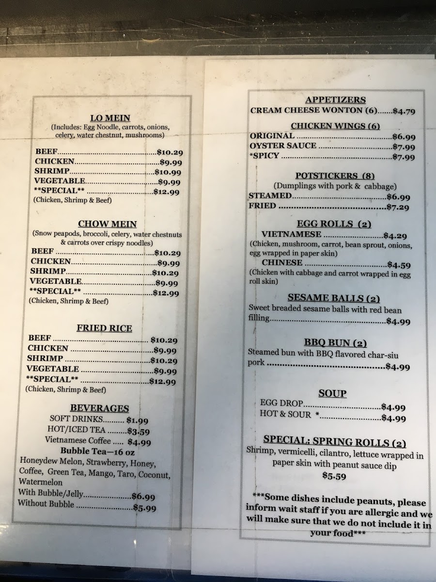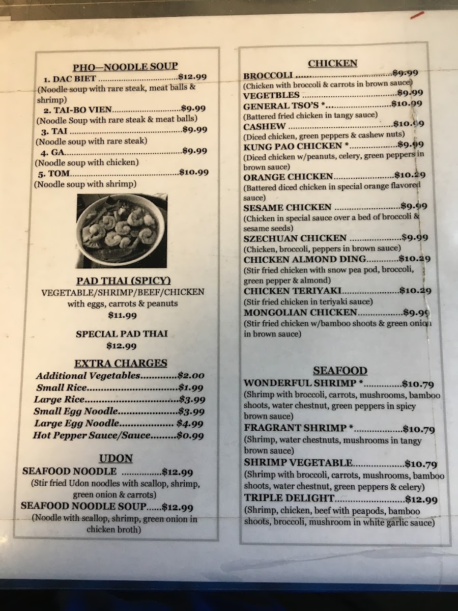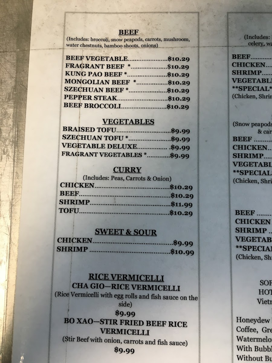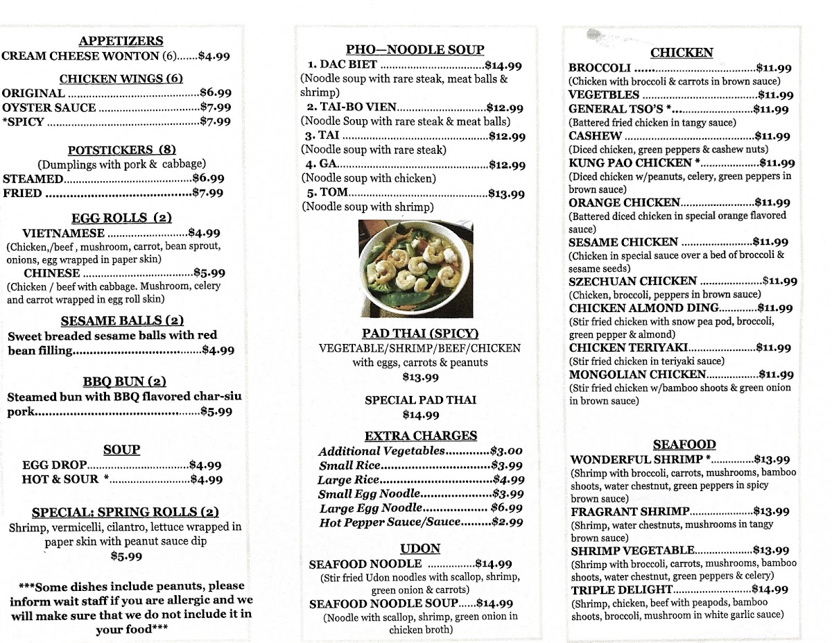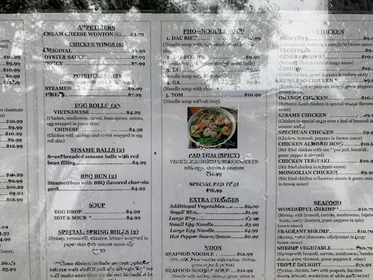 The menu at Lilly's Asian Cafe in Two Harbors, MN, offers a delightful mix of classic and unique Asian dishes. Appetizers like Fried Pickle Rolls and Spicy Battered Pickle Fries set the tone for a flavorful meal, while Tofu Spring Rolls and Fried Cassava Root provide lighter options. The Curry Fried Rice comes in various variations, such as Beef Pickle, Chicken Pickle, and Shrimp Pickle Special, catering to different tastes. For those seeking vegetarian choices, dishes like Veggies Mixed Nuts and Tofu Lemongrass are available. The restaurant also serves a variety of pho, including the popular Dac Biet and Tai-Bo Vien. Those craving noodle soup can choose from options like Seafood Noodle Soup or the comforting Seafood Noodle. Chicken lovers can enjoy favorites like General Tso's, Cashew Kung Pao Chicken, or the zesty Orange Chicken, while beef lovers have the choice of Szechuan Beef and Mongolian Beef. Seafood options are also abundant, with dishes like Wonderful Shrimp and Shrimp Vegetable Triple Delight. Vegetarian options like Braised Tofu and Vegetable Deluxe are perfect for those avoiding meat. Popular side items include Potstickers, available steamed or fried, and an array of rice and noodle dishes, including Lo Mein and Fried Rice in different meat and veggie combinations. The drink menu features refreshing Soft Drinks and the aromatic Vietnamese Coffee. For something extra, try the Special Pad Thai or the hearty Egg Drop and Hot & Sour Soups. Whether you're in the mood for something traditional or craving an adventurous dish, Lilly’s Asian Cafe has a diverse menu that promises a satisfying dining experience.